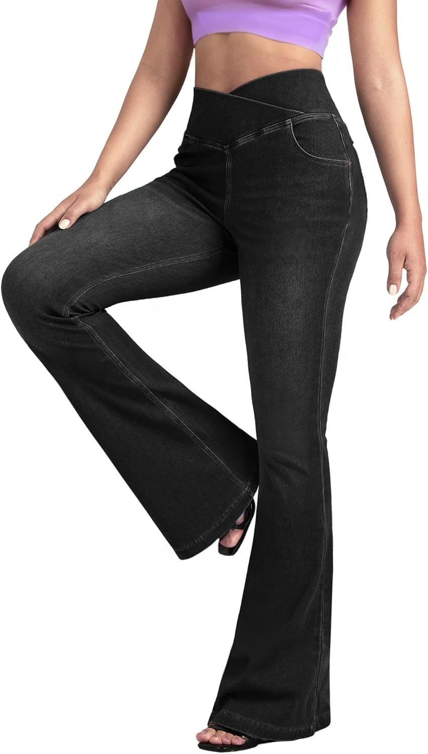 - Stylish High-Waist Design for a Slim Look: Featuring a high-waisted crossover design, these stretchy flare jeans for women highlight a slim waistline and elegant proportions. The unique crossover waist detail adds sophistication, ensuring you stand out effortlessly in any setting.